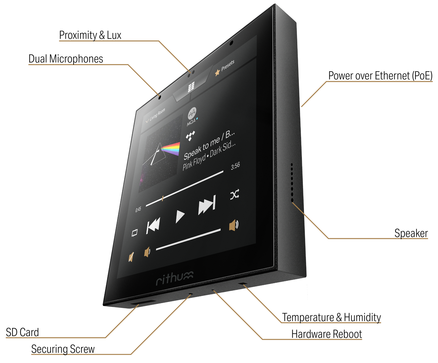 Rithum Switch Pro is an installer-only product and as such incorporates some installer-centric hardware features. Power over Ethernet is the mainstay of installers and the addition of a speaker for door station intercom support makes it suitable for all manner of builds without additional unsightly screens.