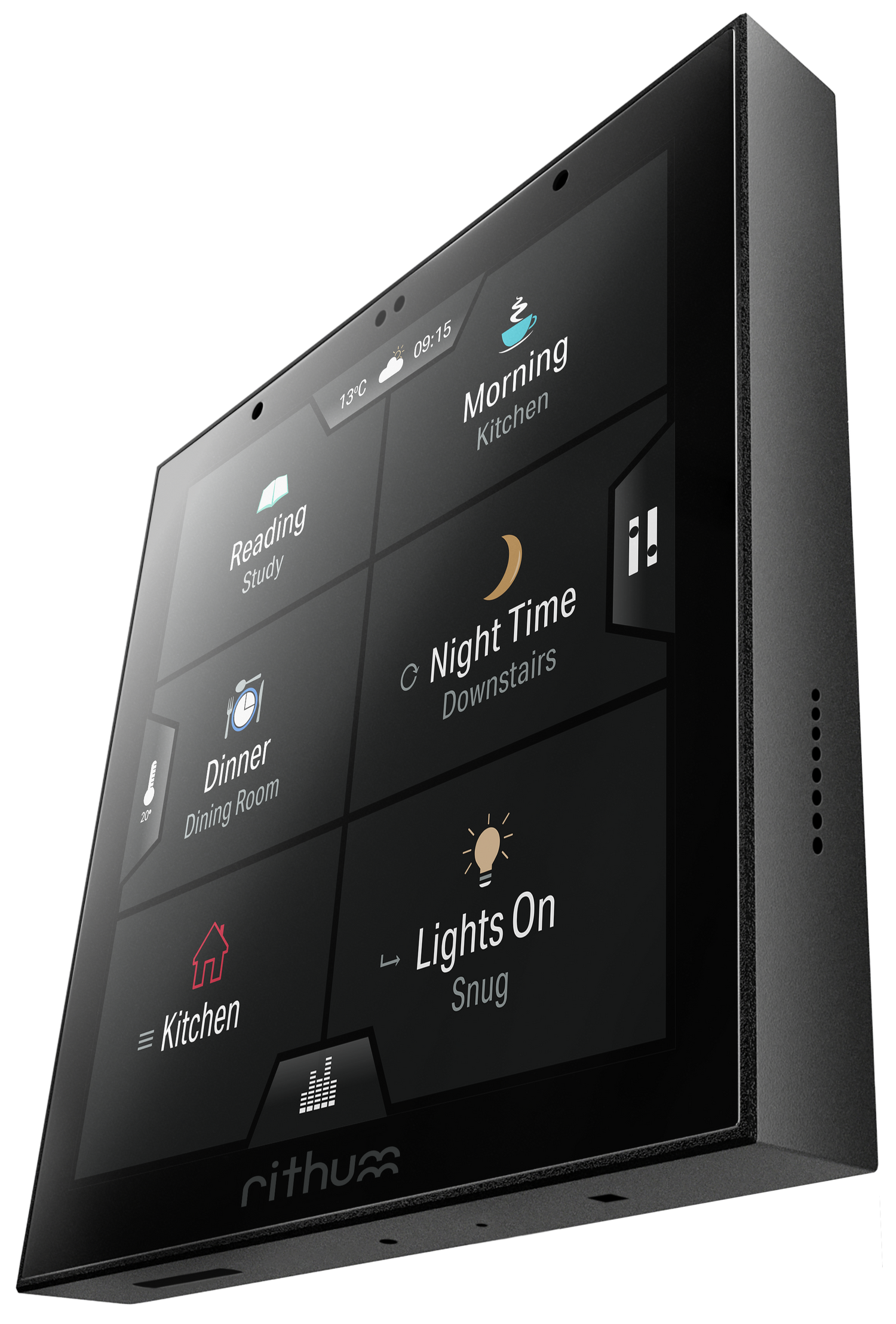 Out-of-the-box Rithum Switch Pro offers control of Philips Hue smart lighting, Sonos audio, and climate control via Rithum Stat's built in temperature sensor.
